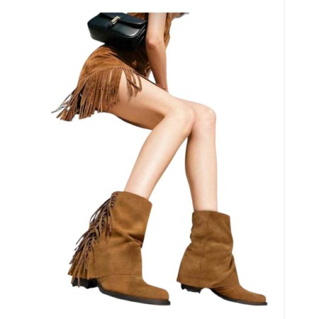 Adoptez un look audacieux et intemporel avec nos bottines western chic noires. Confectionnées en suédine de haute qualité, ces bottines se distinguent par leurs clous métalliques élégants et leur boucle décorative. Avec leur talon bas et leur pointe légèrement effilée, elles allient confort et style, parfaites pour compléter vos tenues du quotidien ou pour une soirée décontractée.