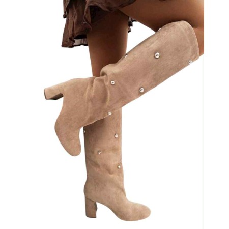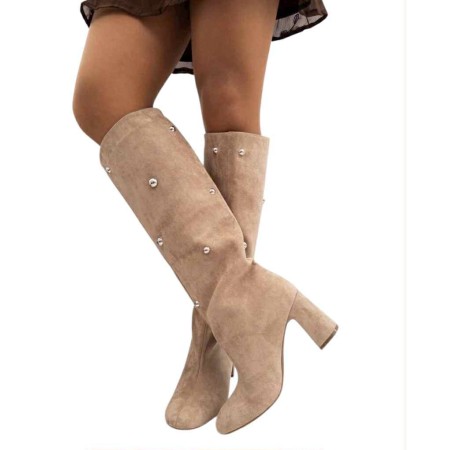 Découvrez nos bottes hautes en daim femme avec talon carré confortable et détails cloutés. Élégantes et stables, disponibles en beige ou noir.